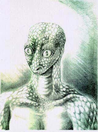 Resposta: Eu sei que isto seria útil para provar a autenticidade desta entrevista se você pudesse tirar algumas fotos minhas. De qualquer forma vocês humanos são muito céticos e (isso é bom para nós e para a verdadeira representação da espécie Alien agindo secretamente neste planeta) mesmo que se você tivesse tais fotos muitos de sua espécie diriam que elas são uma fraude e que eu sou justamente uma mulher humana com máscara ou algo assim (isso seria muito ofensivo para mim). Você deve entender que eu não posso dar permissão a você para tirar foto minha ou de meu equipamento. Isso tem várias razões e eu não quero discutir com você além disto mas uma das razoes é a permanência do segredo de nossa existência e a outra razão é mais religiosa. Todavia você tem permissão para fazer desenhos da minha aparência e de meu equipamento que eu lhe mostrarei mais tarde. Eu também posso tentar me descrever mas eu duvido que outros de sua espécie sejam capazes de imaginar minha verdadeira aparência e de descrever por palavras porquê há uma negação automática da existência da espécie réptil e da existência de outras espécies inteligentes e a outra além da sua própria espécie é parte da programação da sua mente. Bem eu tentarei me descrever.